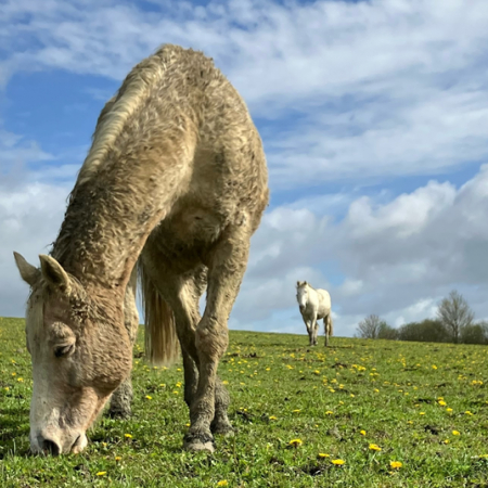 poney hongre, 1,10m, vivait dans une case à veau. Je l'ai racheté, travaillé. Il travaille aux longues rênes mais ne pourra pas être monté, il a une hanche plus basse que l'autre suite à bousculade d'une vache. Vu véto, pas de douleur, pas de soin particulier à faire. Il vit normalement avec 2 autres shetlands.