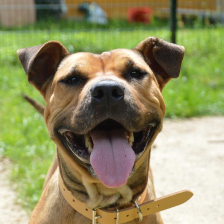 Nana – Femelle croisée Staffy, née en 2024 Nana est arrivée initialement au refuge après avoir été retrouvée attachée à un portail… Elle avait ensuite été placée en centre provisoire, mais est aujourd’hui de retour au refuge suite à des incompatibilités avec les autres animaux. C’est une jeune chienne dynamique, joueuse et très affectueuse, proche de l’humain et pleine d’énergie. Elle aura besoin d’un cadre stable, cohérent et d’une famille capable de canaliser sa fougue avec bienveillance. Conditions de vie • Maison ou grand appartement • OK enfants grands et respectueux • Peut s’entendre avec un mâle (présentation obligatoire) • Pas de femelle • Pas de chats • Pas d’animaux de ferme Nana recherche une famille responsable, prête à s’investir dans son éducation et à lui offrir une vie équilibrée, faite de jeux, de dépenses physiques et de moments de tendresse